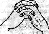 Пальцы сцепить в замок. Концы пальцев правой руки нажимают на верхнюю часть тыльной стороны ладони левой руки, прогибая ее так, что пальцы левой руки встают, как петушиный гребень.